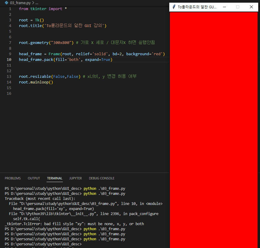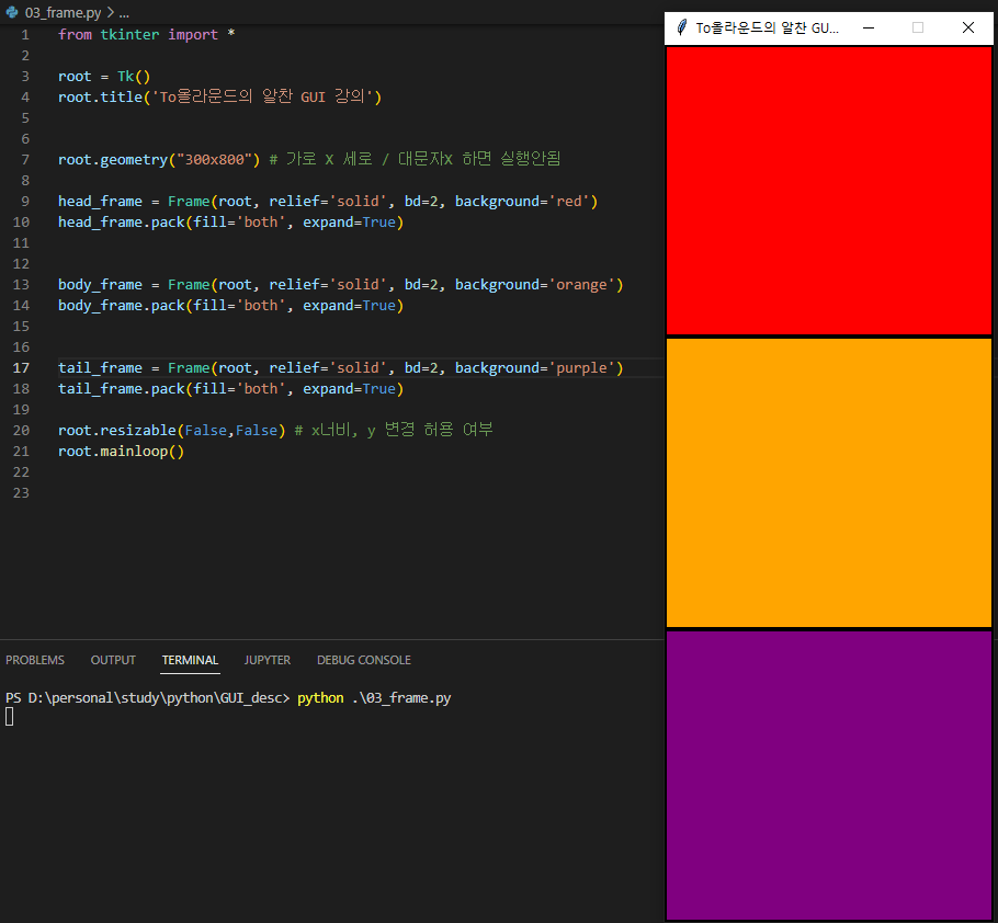 - 그리고 10라인의 pack()을 실행해야 선언한 해당 frame이 지정된 윈도우(root)창에 나타나게 됩니다.