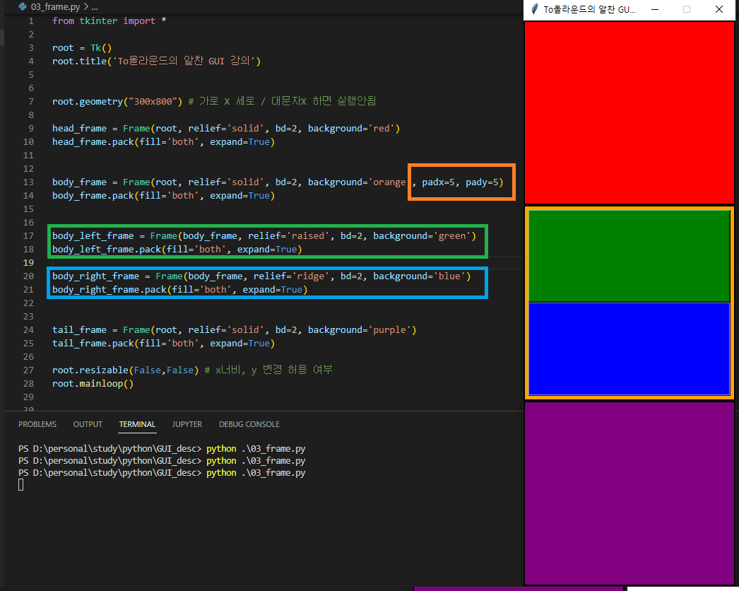 - 13라인의 padx와 pady를 통해 내부의 여백을 설정할 수 있습니다. 해당 값이 0이면, 주황색 영역이 사라지고,