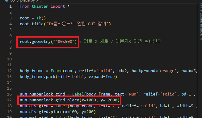 - 사용방법은 간단하다. 해당 요소(위젯).place(x=x 좌표, y= y 좌표) 값을 입력해주면된다.