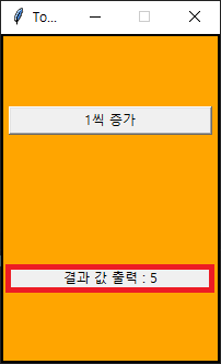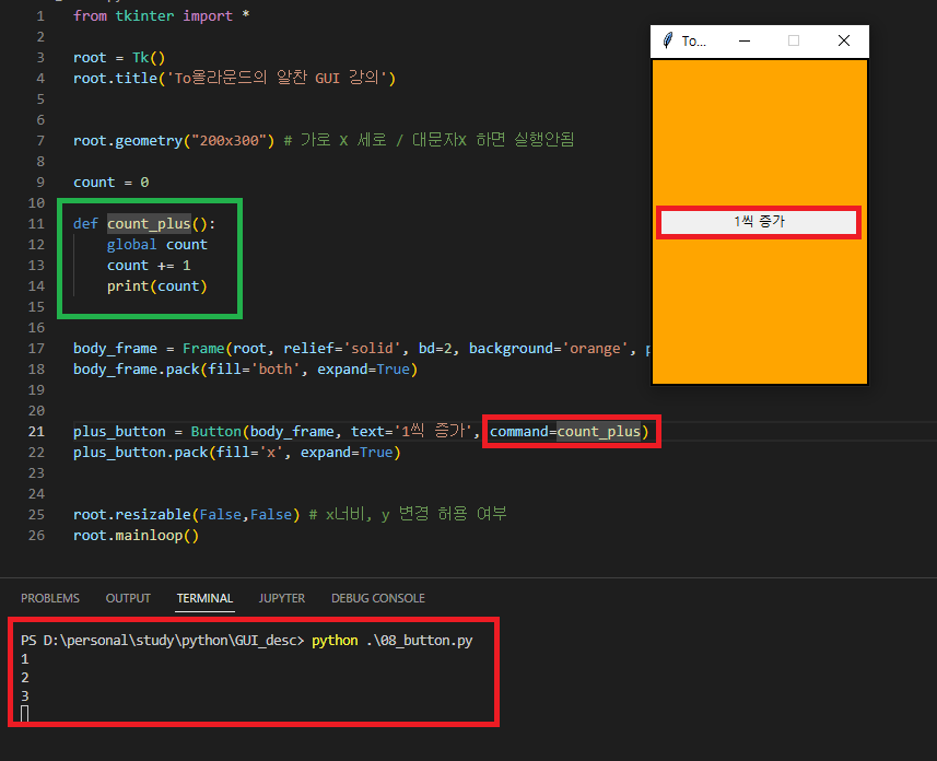 위와 같이 코드를 작성할 수 있는데, [command = 함수명] 을 넣어주면 되고, GUI 상의 '1씩 증가' 버튼을 누를 때 마다