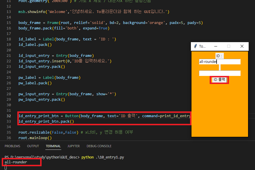 - 해당 함수를 호출하는 id_entry_print_btn(32라인)을 생성하여 호출 버튼을 눌러보면