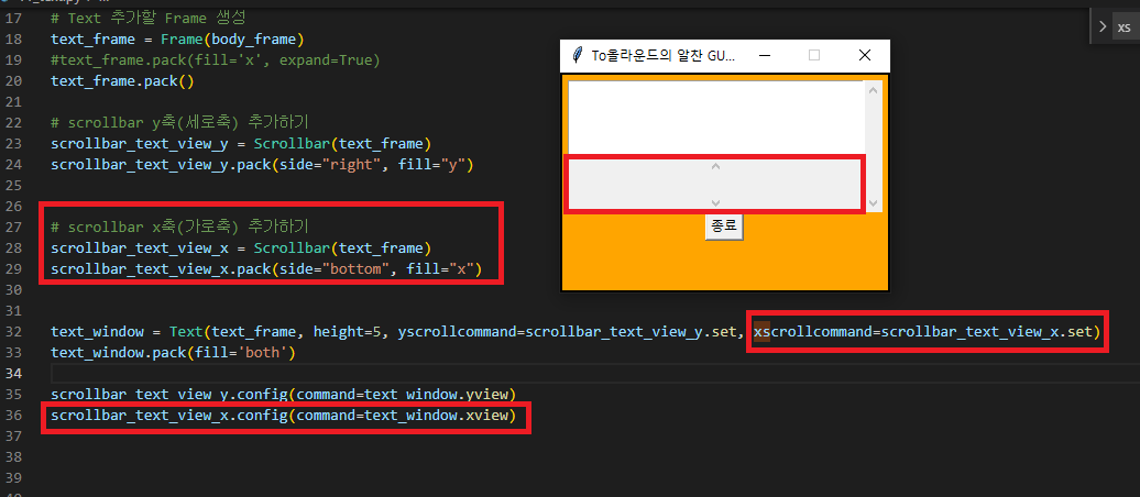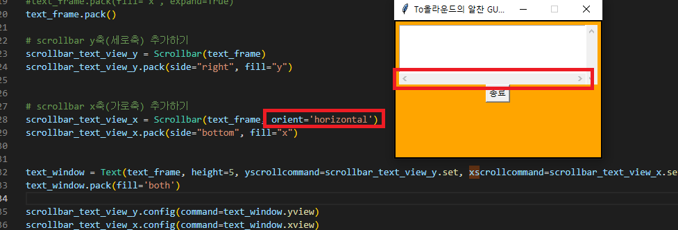 - 아래 코드 28라인처럼 Scrollbar를 생성할 때, orient 파라미터에 'horizontal' 을 적용해주면