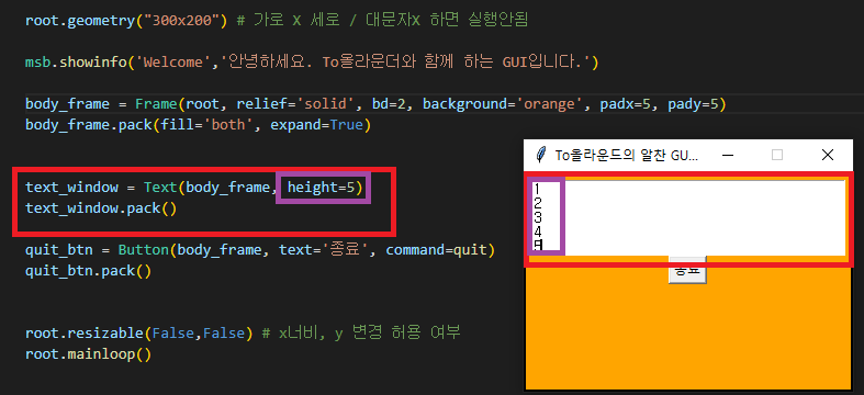 - height는 GUI에서 한번에 보여주는 창의 높이라고 생각할 수도 있는데, 해당 값을 5로 할당하였을 때,
