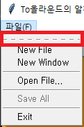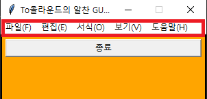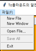 menu_bar.add_cascade(label="파일(F)", menu=menu_file) # 해당 항목 누락시 나타나지 않음. 다른 위젯 pack과 같은 기능