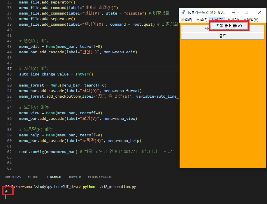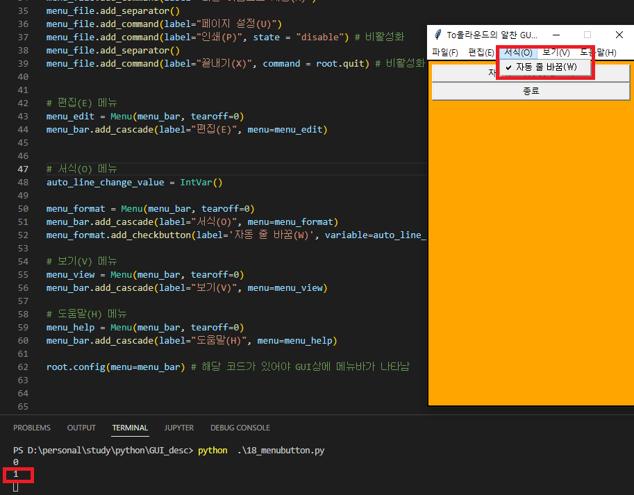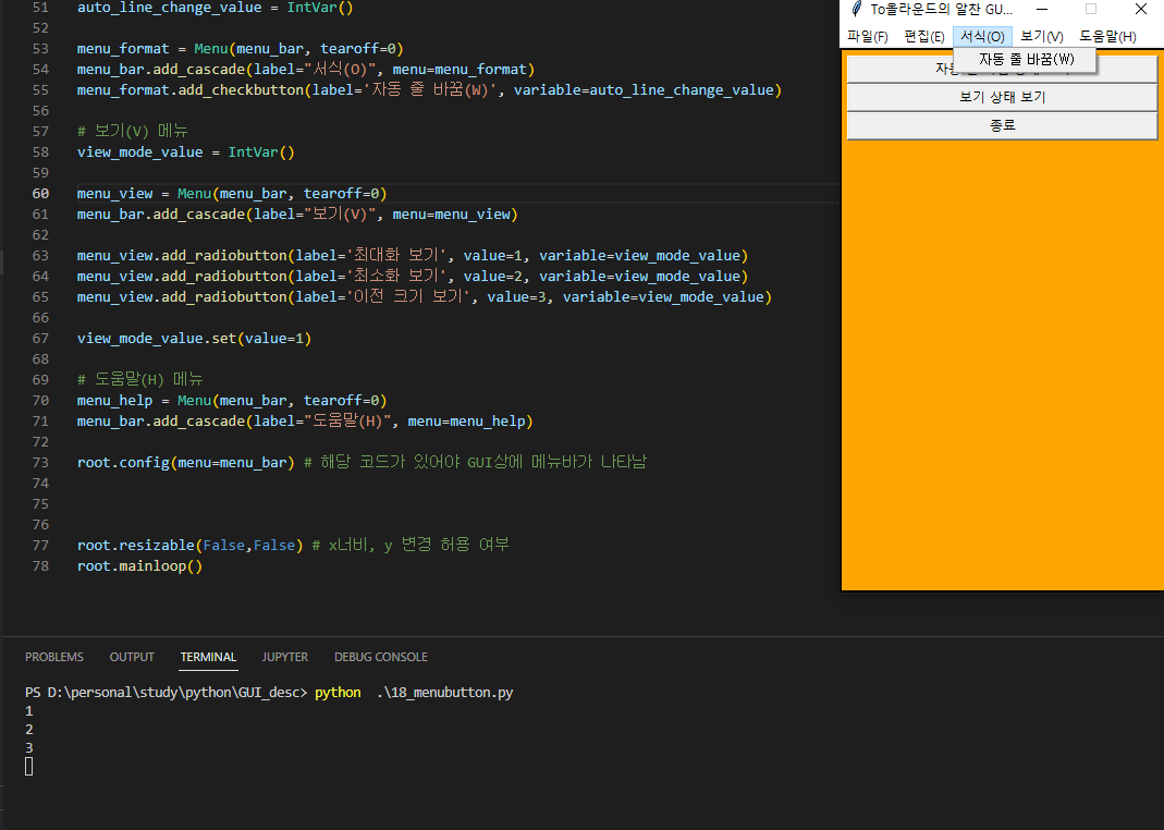 menu_auto_line_change_value_btn = Button(body_frame, text='자동 줄 바뀜 상태 보기', command= lambda : print(auto_line_change_value.get()))