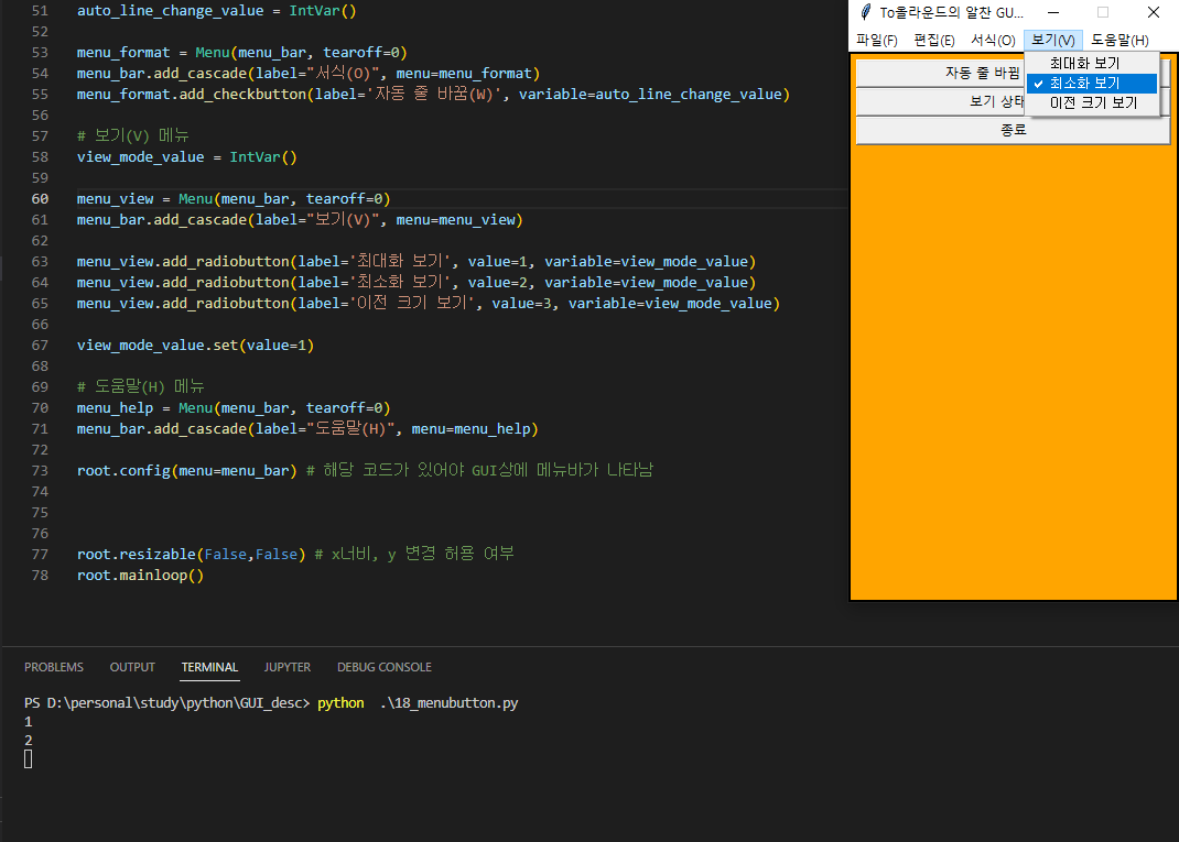 menu_view.add_radiobutton(label='최소화 보기', value=2, variable=view_mode_value)