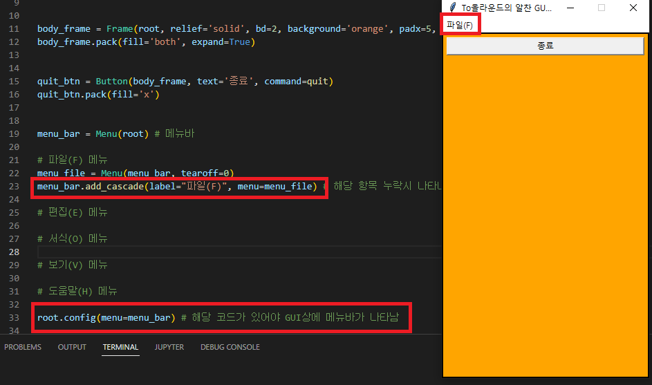 - 19라인 : menu_bar라는 변수로 Menu 위젯을 생성한다. 다른 위젯들의 경우, pack이나 grid 등의 매서드로 GUI상에 나타나게 해주었듯이, 33라인에 있는 config 항목과 22~23 라인과 같이 1개 이상의 menu 항목이 있어야 GUI 상에 표기된다.