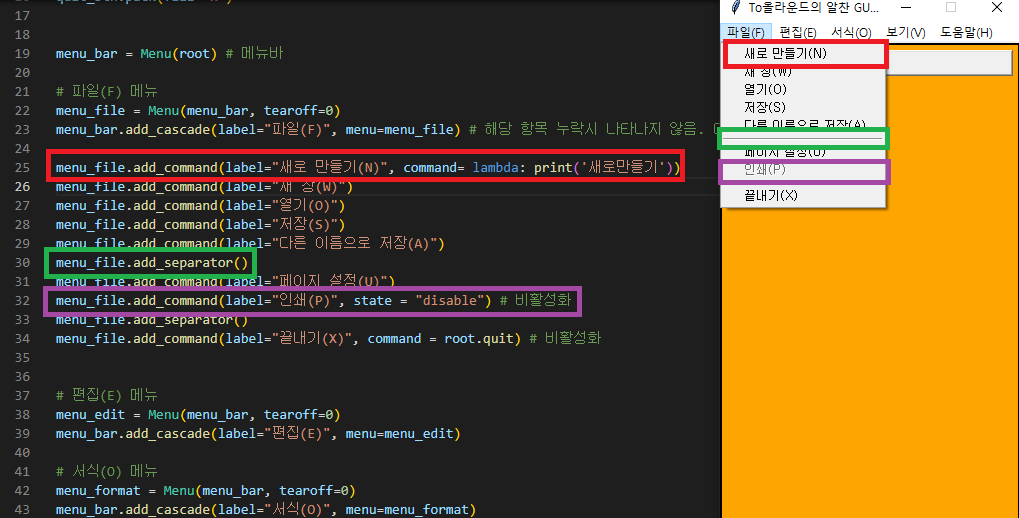 menu_file.add_command(label="새로 만들기(N)", command= lambda: print('새로만들기'))