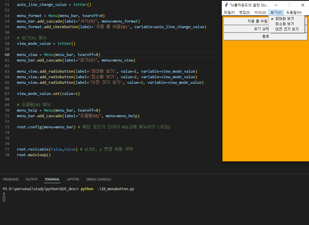 menu_view.add_radiobutton(label='최소화 보기', value=2, variable=view_mode_value)